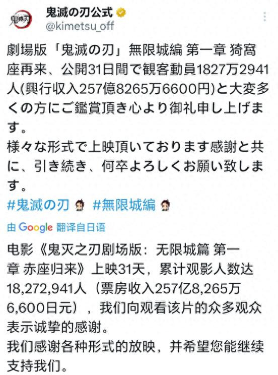 凭据《鬼灭之刃》的官方公告,咱们不错知说念,《鬼灭之刃》的新作无穷城篇第一章猗窝座回来,上映仍是有31天(即一个整月)了,累计不雅影的东说念主数达到了一千八百多万东说念主,而对应的票房收入则达到了惊东说念主的257.8亿日元!