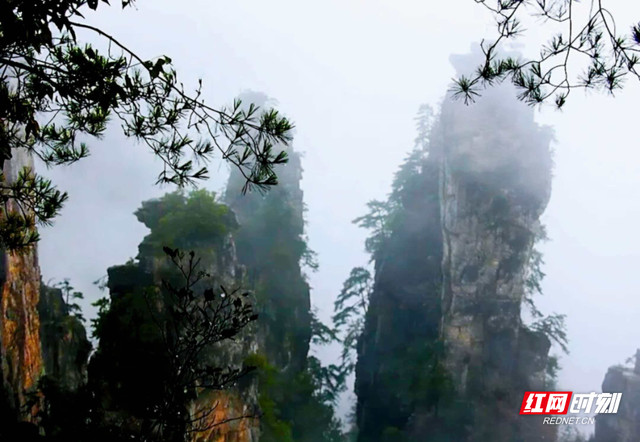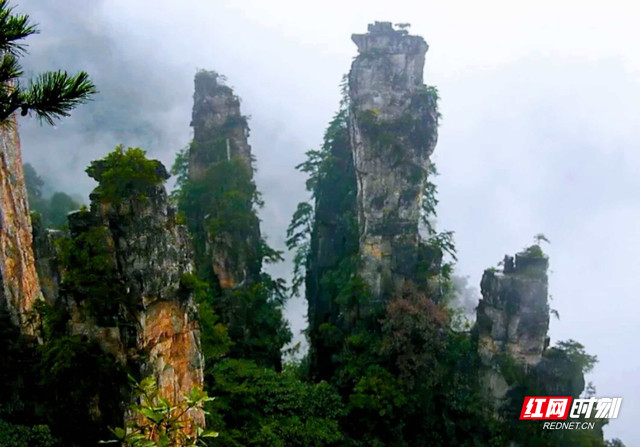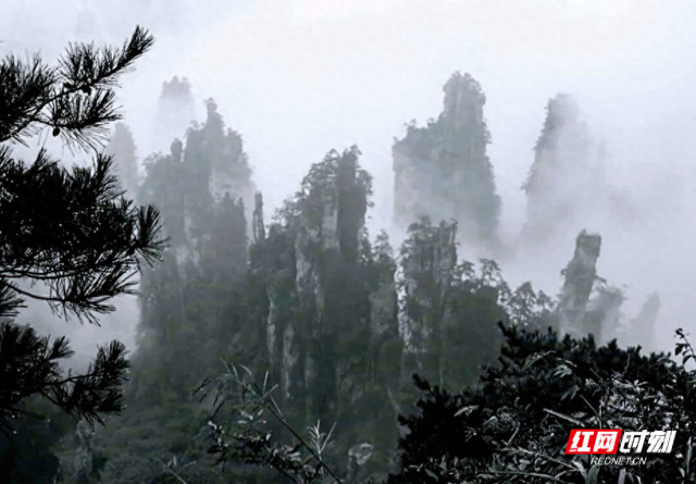 连日来,湿润的水汽与峰林再会,将皇帝山化作一座被霏霏拥吻的“空中盆景”。石英砂岩峰林拔地而起,或如剑指天穹,或似少女献花,在缥缈云烟中若有若无;强盛的武陵松扎根岩壁,虬枝舒展,与嶙峋怪石相映生辉,每一处景致都凝练着当然的鬼斧神工。