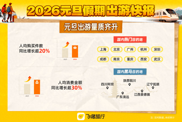 受“请3休8”拼假攻略的强力出手,2026年元旦旅游商场火热开局。1月3日,飞猪发布的《2026元旦假期出游快报》露馅,最热主见地南京排前十,破钞者出游意愿与消吃力双双晋升,东谈主均购买件数同比增长超20%、东谈主均破钞金额同比客岁增长超30%。1月1日元旦今日,国内栈房预订量同比客岁劲增280%,国内主见地玩乐商品预订量同比增长超270%。