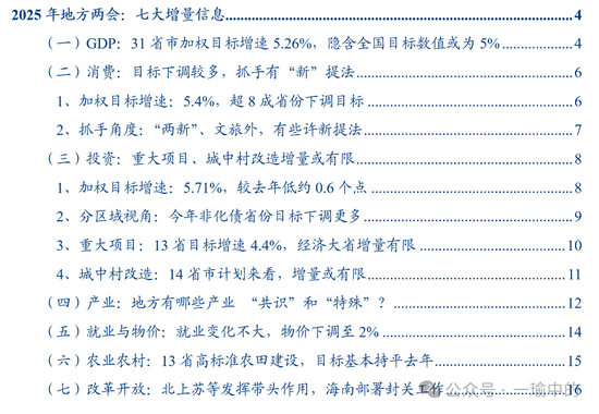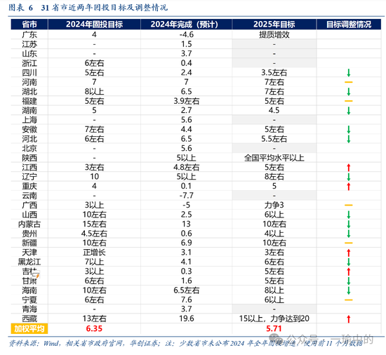 1)分地区来看:非要点化债省份策划下调幅度更大,经济大省策划相对保守。9个要点化债省份本年固投策划增速平均为5%,较旧年上调0.17个点。10个非要点化债省份本年为5.65%,较旧年下调0.95个点。关于6个经济大省,广东、浙江未再设立策划;四川将策划从旧年的5%傍边下调至3.5%傍边;河南表述从7%变为“7%傍边”。