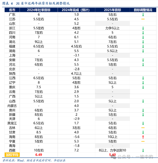 从社零策划增速来看,柔软有可比数据的22个省市。2025年加权策划增速为5.4%,旧年为6.49%。其中,18个下调策划,3个看护不变,1个上调。从旧年情况来看,2024年制定策划的25省市中,瞻望仅有1省完成策划。