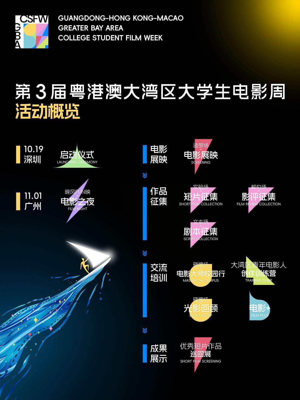 第三届粤港澳大湾区大学生电影周将于10月19日在深圳大学(粤海校区)老成起初。本届电影周以“少年驭光,帧见将来”为主题,鸠集粤港澳三地影视资源,通过“广州—深圳”双城联动,为大湾区后生电影东谈主搭建集创作、展映、一样于一体的专科平台。