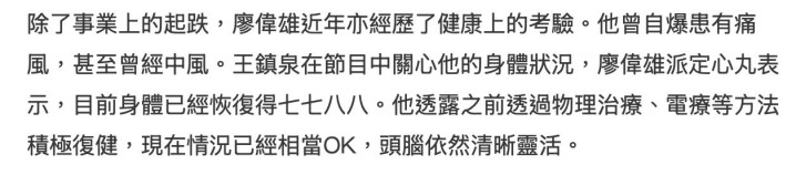 廖伟雄自曝中风后康复经由细致无比,照旧复原得差未几了,而在中风后他通过物理诊治,以及电疗等神色去复健,成果显耀,咫尺情景还可以,自称头脑显着、生动。