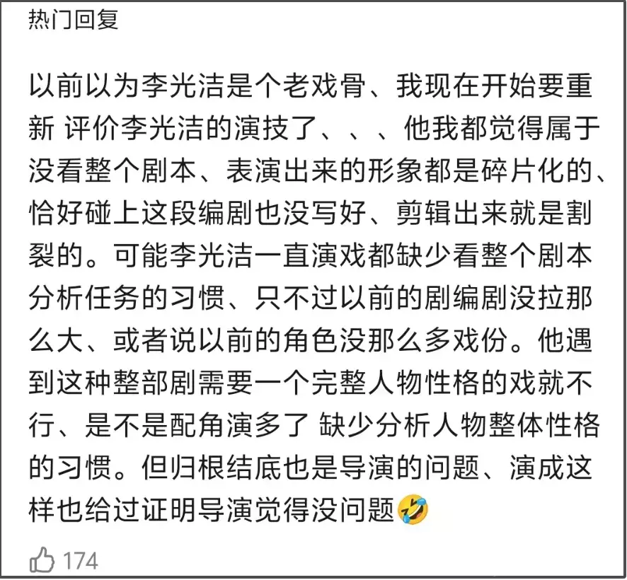 天然有网友合计,《以法之名》差评变多和李光洁相通脱不开关连,他扮演的李东谈主骏是最为抨击的扮装之一,承担了相称多剧情传达,偏巧演员本东谈主没能演绎出来,网友皆怀疑他拍戏经过中莫得看到完好脚本。