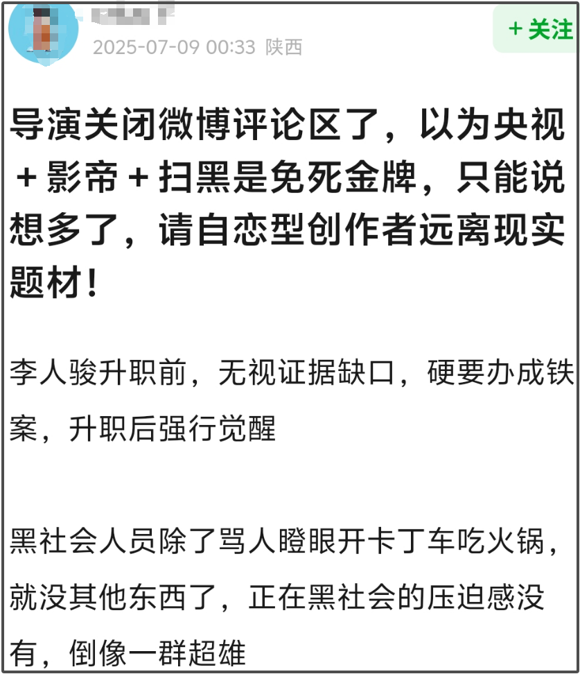 不啻一位网友合计,导演关闭评述区不经受外界宗旨,过于玻璃心了,创作家应该学会经受月旦,卓绝是如今《以法之名》绝大无数差评皆出在剧情和节拍上,又是导演又是编剧的傅东育可不是该背起最大的锅吗?