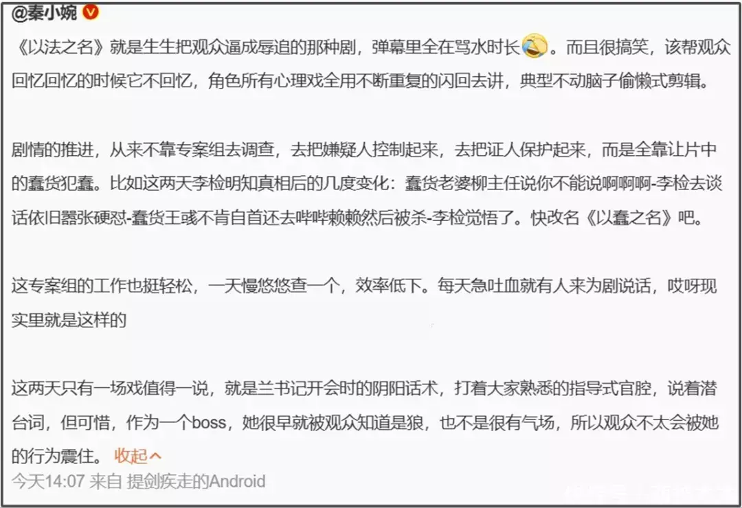 正如网友所说,《以法之名》前半段关联开发组的剧情完成出色,拍了不少高光片断,演员演技加抓之下,成功出圈累积了好口碑。