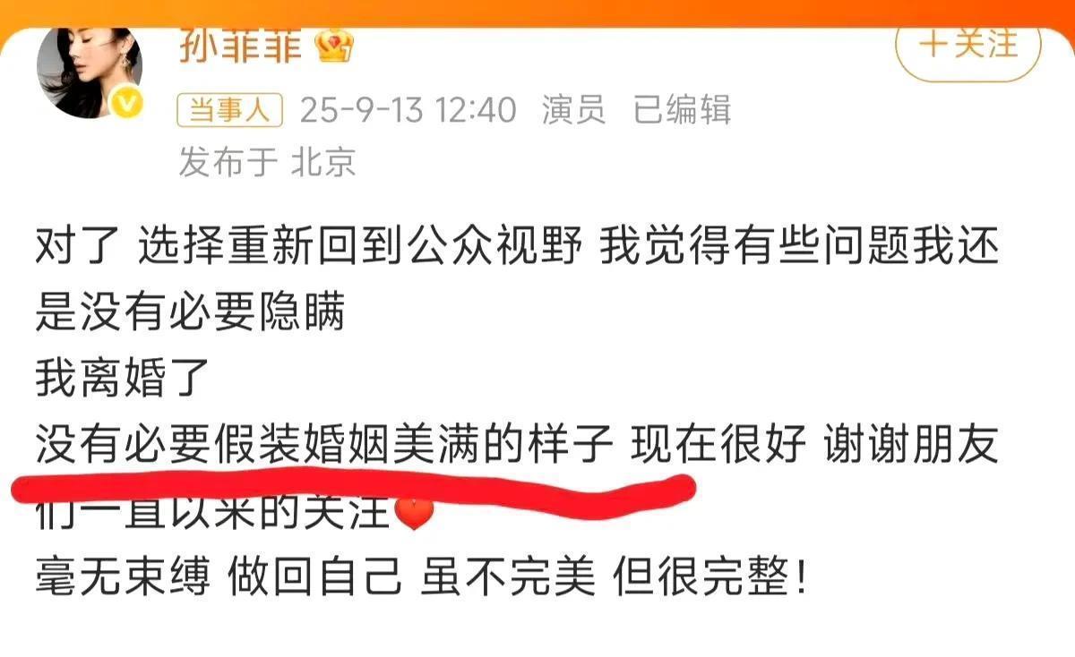 9月13日,演员孙菲菲倏得官宣离异,一句“我本念念作念年老的女东谈主,却活成女东谈主心中年老”引爆热搜。她坦承与联念念高管史宏的婚配走到止境,坦言:“婚配不完好但完整,牝牡同体的力量让我涅槃腾达。”