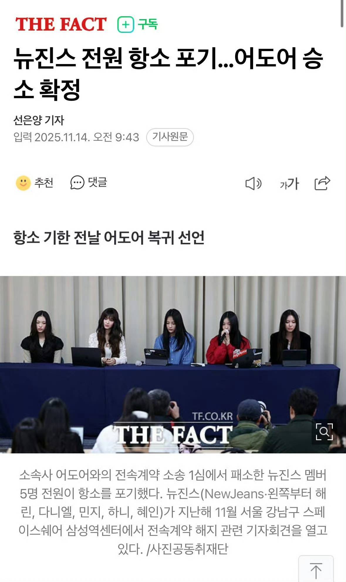 其时5名成员暗示尊重判决,但也决定再提上诉,称与ADOR间的信任已离散。可就在11月12日,ADOR发表声明,Haerin、Hyein决定回首公司。没念念到仅2小时后,Minji、Hanni、Danielle也晓谕回首。