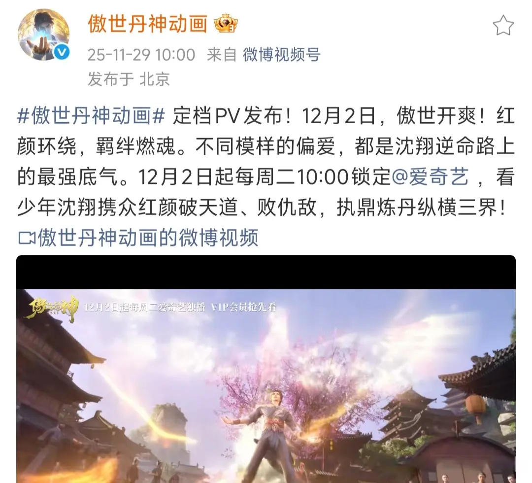 2个篇章悉数24集。《傲世丹神》动画将于12月2日上昼10点在爱奇艺播出,世界不要错落伍辰哦。