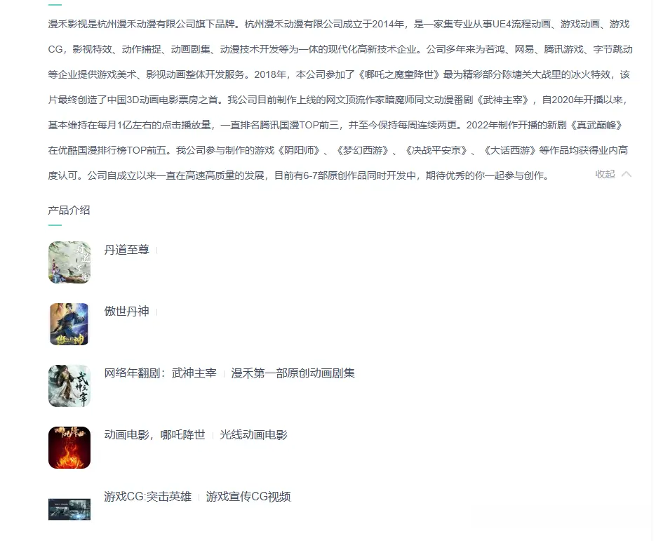 漫禾文化缔造于2014年,是一家深耕原创动漫开垦及游戏好意思术管事外包为主要见地业务的动漫公司,参与过《武神足下》、《真武巅峰》、《哪吒之魔童降世》等作品的制作了。
