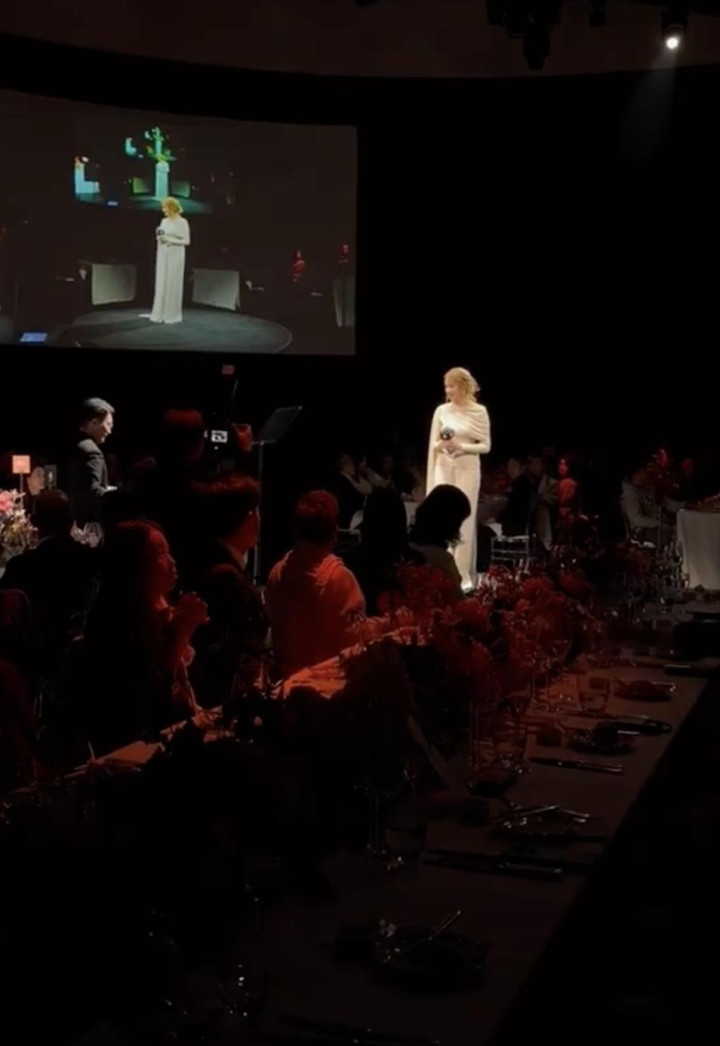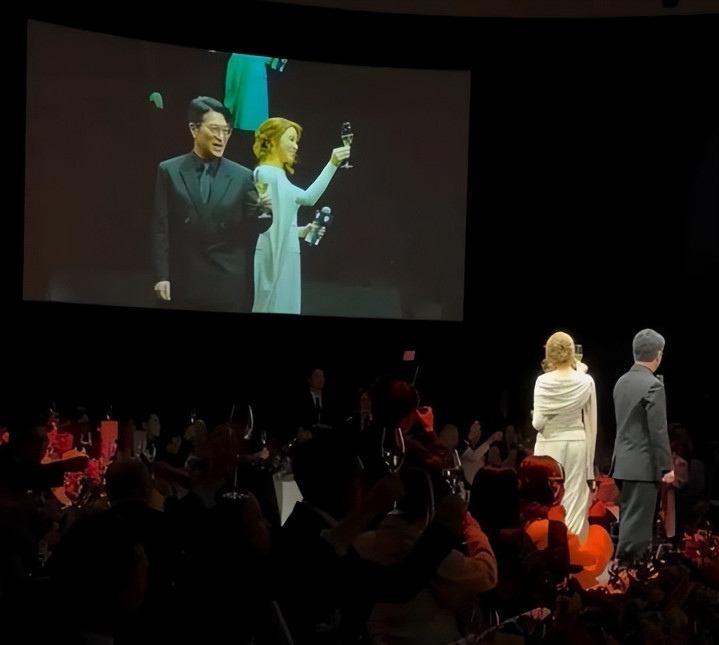 这场晚宴压轴出场时,满场商界巨头站起身等她上台,碰杯问候,全场静听她致辞——莫得镁光灯,却尽是敬意。