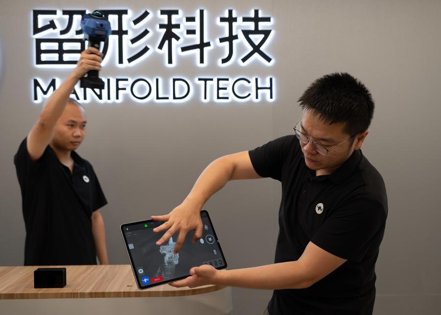 在深圳前海的深港后生梦工厂,留形科技联结独创东谈主徐威(前)展示居品后果。新华社记者 刘梦琪 摄