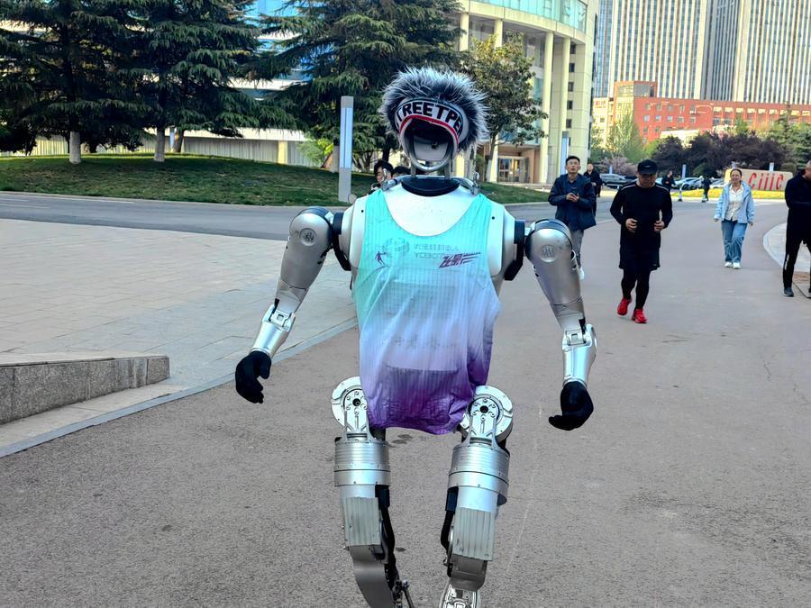 山东优宝特智能机器东谈主有限公司研制的东谈主形机器东谈主“行者泰山”进行马拉松西宾。新华社发