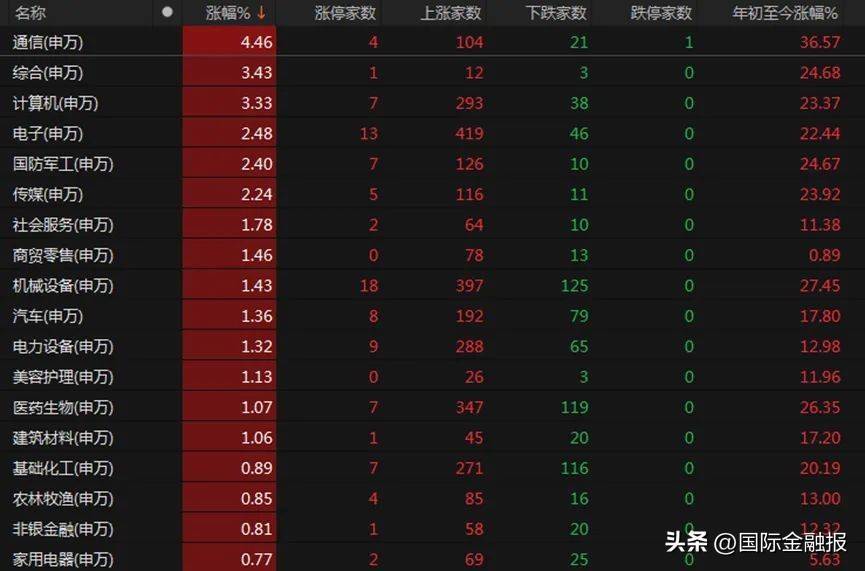 31个申万一级行业中,仅石油石化、房地产板块微跌。14个板块涨幅超过1%,通讯板块以4.46%涨幅当先全场,德科立、锐捷收罗、剑桥科技、东信和平涨停;详尽、狡计机板块涨幅超过3%,亚泰集团涨停,科创信息、大理智、淳中科技、华胜天成、中科金财、智微智能、中安科也纷纷涨停。
