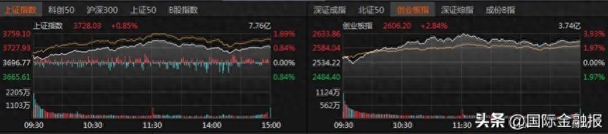 沪指盘中一度冲至3745.94点,创十年新高,最终收涨0.85%报3728.03点;创业板指收涨2.84%报2606.2点,冲破昨年10月8日2576.22点的高点;深证成指收涨1.73%。沪深300、上证50微涨,科创50涨幅超过2%,北证50涨近7%。