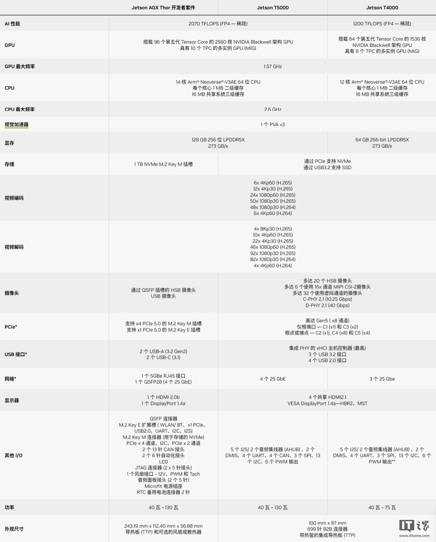 IT之家附 Jetson Thor 系列三款居品主要成立如下: