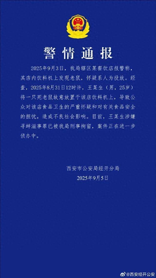2025年9月3日,我局辖区某餐饮店报警称,其店内饮料机上发现老鼠,怀疑系东说念主为投放。经查,2025年8月31日12时许,王某生(男,25岁)将一只死老鼠成心搁置于该店饮料机上,导致公众对该店食物卫生的严重怀疑和对琢磨食物安全的担忧,变成不良社会影响。当今,王某生涉嫌挑衅惹事罪已被我局刑事拘留,案件正在进一步侦办中。